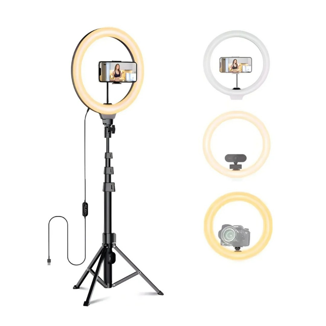 Kit de Aro luz LED de 12” + trípode, este aro de luz cuenta con cable USB para alimentar la luz, puedes controlar la intensidad de luz y cambiar de luz fría a luz cálida, es ideal para Youtuber, Selfie, etc. Incluye trípode metálico.