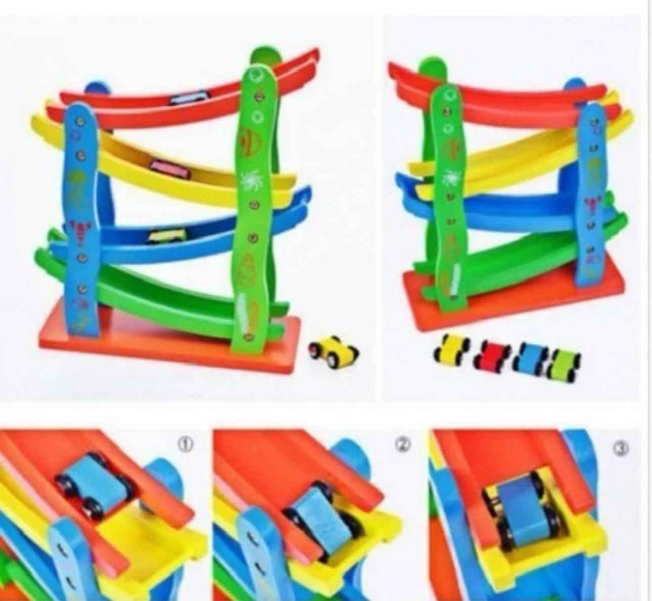 Diseño clásico: este clásico juguete de carreras de rampa tiene cuatro rampas, coloque el auto de carreras de madera en la parte superior y correrá nivel a nivel hasta la parte inferior, y no se atascará, así que deje que los niños se diviertan por completo.