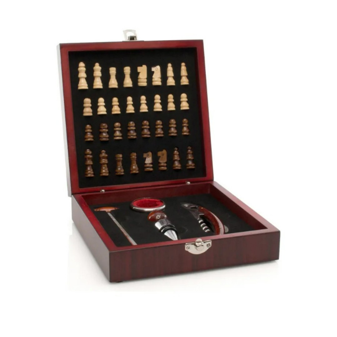 Caja De Madera De Ajedrez + 4 Accesorios Set De Vino