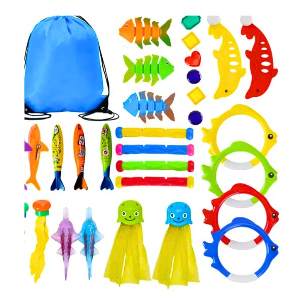 Divertido set de 30 piezas acuáticas diseñado para estimular el juego activo en piscinas, bañeras o playas. Incluye aros flotantes, varillas, anillos hundibles y objetos coloridos que se sumergen para que los niños los recuperen buceando. Fomenta la coordinación mano-ojo, control de la respiración, motricidad y familiaridad con el entorno acuático. Fabricado en plástico blando, seguro y resistente. Colores vivos que son fáciles de ver bajo el agua. Perfecto para juegos grupales, clases de natación o diversión familiar.