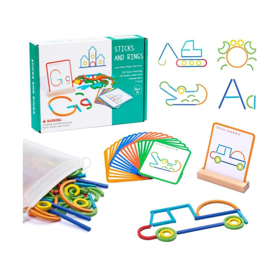 Este increíble set educativo Sticks and Rings incluye 120 piezas de colores en forma de palitos y aros de madera, perfectos para que los niños desarrollen su creatividad, motricidad fina y reconocimiento de formas, letras y figuras.