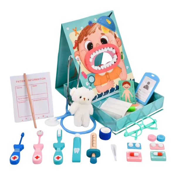Set de juego de roles "Dentista" que permite a los niños simular una consulta odontológica completa. Incluye un modelo de boca con dientes extraíbles, espejo dental, pinzas, jeringa (sin aguja), cepillo de limpieza, prótesis móvil y tarjetas ilustradas con caries, sonrisas sanas y tratamientos. Además, trae accesorios divertidos: bata miniatura, gafas protectoras, tarjeta de identificación personalizable y pizarra magnética para anotar "diagnósticos".