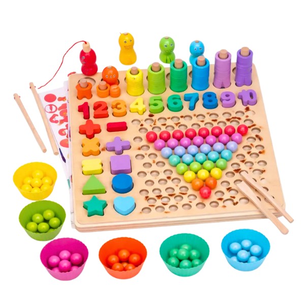 El juego educativo de madera con números y colores es una herramienta ideal para el aprendizaje temprano. Compuesto por un tablero multifuncional, números del 1 al 10, piezas geométricas en varios colores, bolitas para clasificar y accesorios como pinzas o cucharas (según modelo), fomenta el pensamiento lógico y las primeras nociones matemáticas. Fabricado en madera resistente con bordes suavizados, garantiza seguridad y durabilidad.