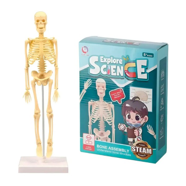 Intrigante modelo de esqueleto humano armable, diseñado para que los niños exploren la anatomía de forma divertida y educativa. Compuesto por piezas detalladas en plástico ABS no tóxico, que representan huesos como cráneo, columna vertebral, costillas, fémur y extremidades. Las piezas encajan fácilmente, fomentando el aprendizaje visual y táctil del sistema óseo. Incluye guía ilustrada con nombres de huesos y datos curiosos. Perfecto para estimular el interés por la ciencia, desarrollar motricidad fina y mejorar la coordinación ojo-mano. Ideal para uso en casa, escuelas o como regalo STEM.