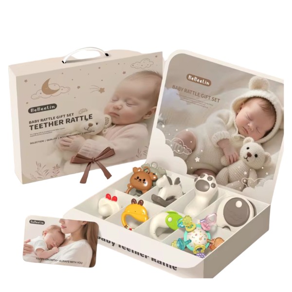 Caja regalo premium diseñada para acompañar el desarrollo de bebés recién nacidos (0-3 meses). Incluye una selección cuidadosa de juguetes sensoriales: sonajeros suaves, mordedores de texturas variadas, libro de tela lavable y tarjetas visuales en alto contraste (blanco y negro) que estimulan la vista en etapas tempranas. Todos los materiales son seguros, libres de BPA y aptos para lactantes. Perfecto para fortalecer la coordinación mano-ojo, el tacto, la audición y el enfoque visual. Presentado en una caja elegante, ideal como regalo para baby showers, nacimientos o primeros días.