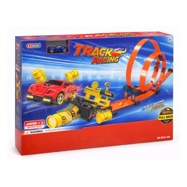 Set de pista de carreras para niños que incluye una emocionante rampa con loop 360°, un auto de juguete con sistema pull-back (retroceso) y múltiples piezas modulares fáciles de armar. Solo tira el auto hacia atrás, suéltalo y ¡listo para despegar por la pista a gran velocidad! El diseño dinámico mantiene al niño entretenido mientras mejora su coordinación ojo-mano, percepción espacial y habilidades motoras. Fabricado en plástico resistente, seguro y ligero. Incluye señalización, curvas, rectas y elementos decorativos para personalizar cada circuito. Fácil de montar, desarmar y guardar.