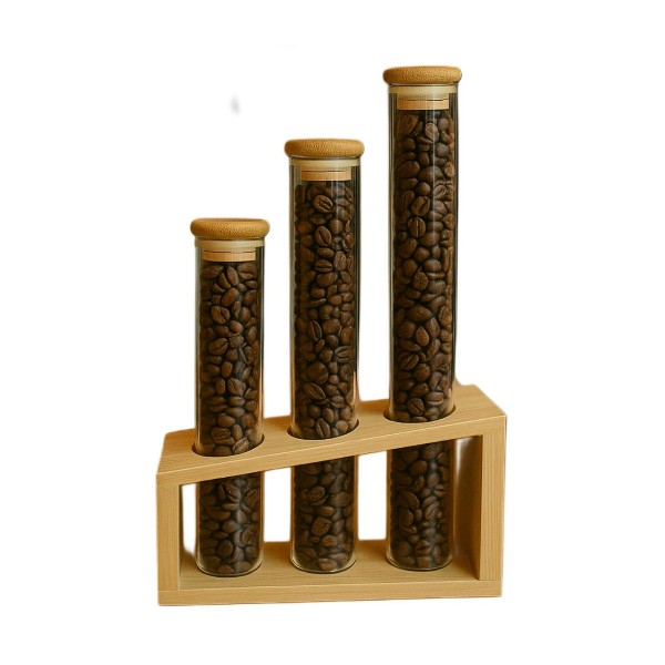 Este increíble set incluye 3 frascos tipo tubo de vidrio transparente con tapas de bambú herméticas y base de madera, diseñados para almacenar café en grano, té, condimentos, especias, snacks y más.