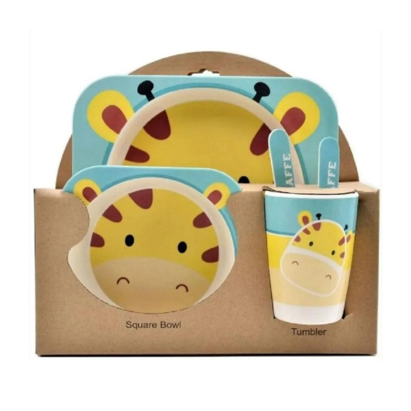 1 plato, 1 bowl, 1 vaso y cubiertos (tenedor y cuchara), todos elaborados con fibra de bambú ecológica, libre de BPA y materiales tóxicos.