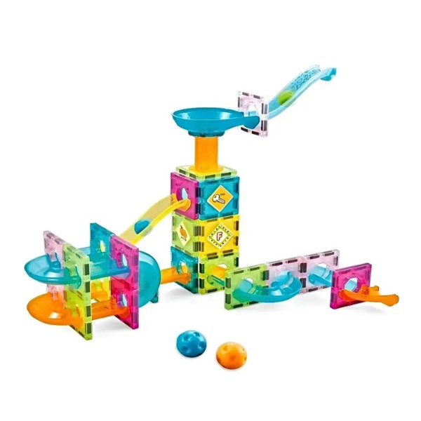 El Set de Construcción Magnético DIY 61p es mucho más que un juguete: es un laboratorio de física y creatividad en formato lúdico. Los niños ensamblan rampas, torres, puentes y laberintos conectando paneles mediante imanes integrados en los bordes. El efecto visual es sorprendente: al lanzar las esferas, pueden seguir su trayectoria a través de los caminos translúcidos, analizando cómo se aceleran en descensos o ralentizan en giros cerrados.