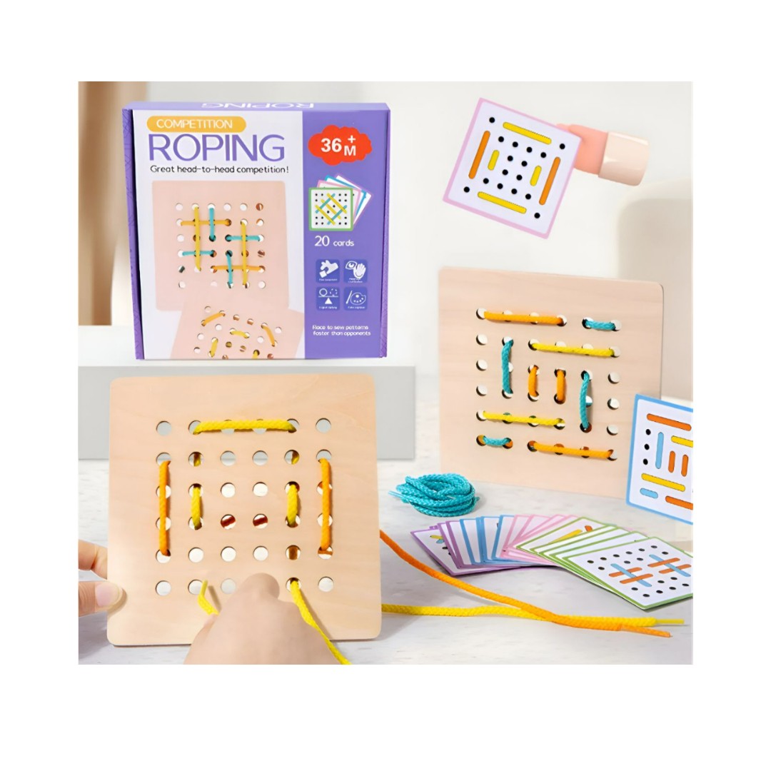 Estimula la concentración, la coordinación y el desarrollo cognitivo de los más pequeños con este divertido juego de enhebrar con tarjetas y cordones.