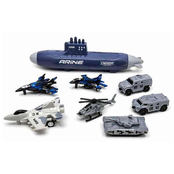 Set militar de juguete con submarino grande, aviones de combate, helicóptero, tanque y vehículos terrestres. Incluye accesorios como misiles. Fabricado en material resistente y seguro. Perfecto para escenarios de acción y rescate.